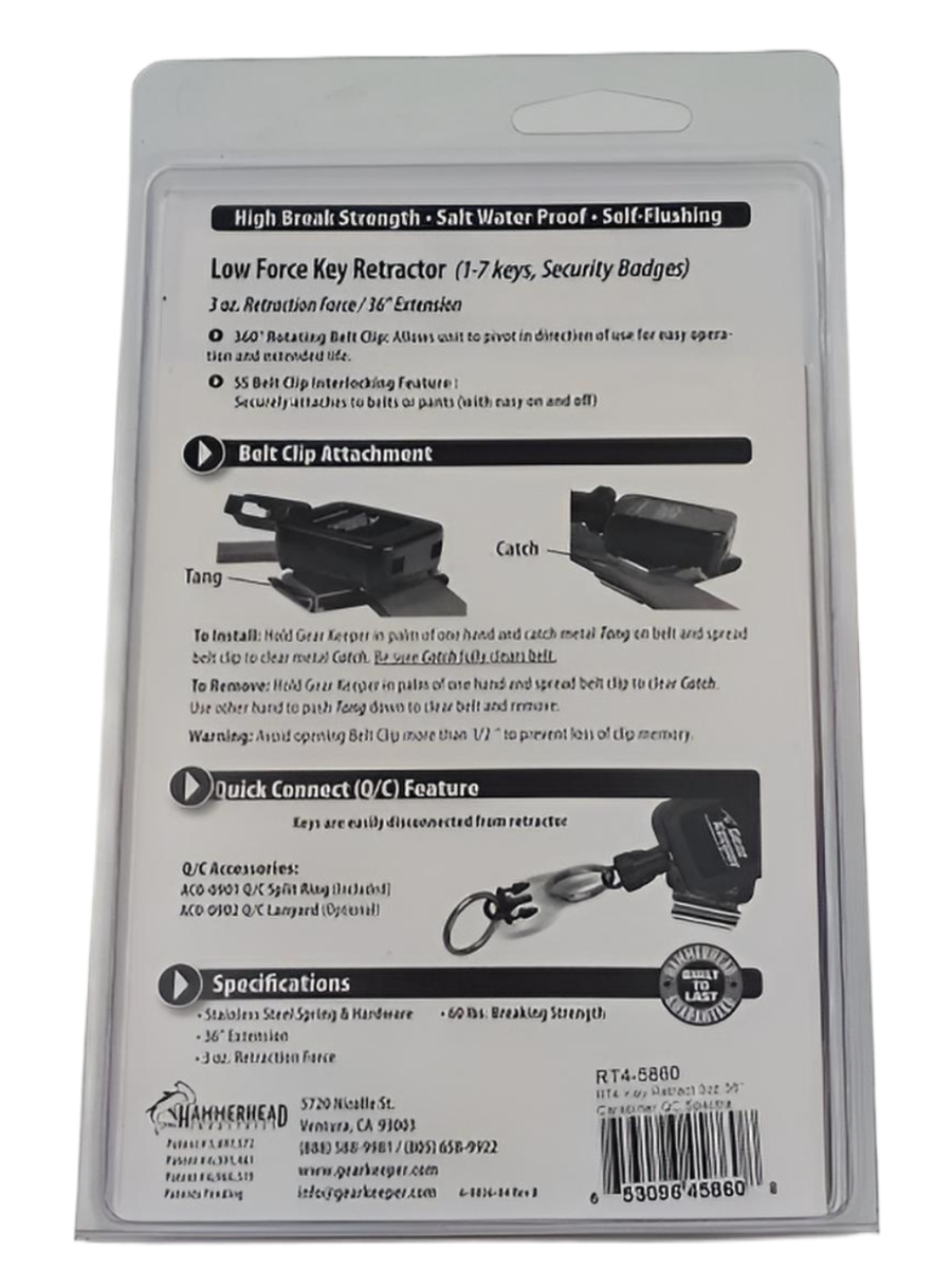 Dank des robusten Karabinerhakens lässt sich der Retraktor einfach an Gürtel, Gürtelschlaufe oder Tasche befestigen. Die starke, nylonbeschichtete Kevlar-Leine lässt sich sanft auf 91 cm ausziehen und zieht sich automatisch mit einer angenehmen Einzugskraft von 85 Gramm wieder ein.