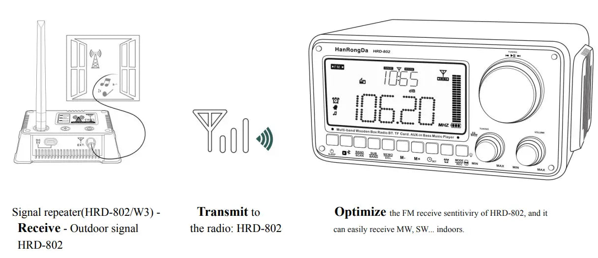Der Repeater empfängt Signale im Freien über seine 3 Meter lange Empfangsantenne und leitet sie drahtlos an das Funkgerät HRD-802 weiter. So genießen Sie störungsfreien Empfang von Kurzwellen-, Mittelwellen- und Flugfunkfrequenzen, selbst in Gebieten mit eingeschränkter Netzabdeckung.