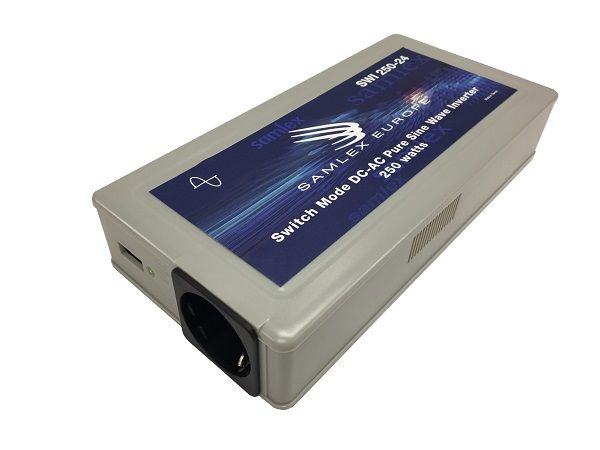 Dieser hocheffiziente DC-AC-Wechselrichter wandelt 24 Volt Gleichstrom in 250 Watt reine Sinuswellen-Wechselstromleistung bei 230 Volt, 50 Hz um. Das Gerät ist mit einem modularen Batterieanschluss ausgestattet. Zu den Funktionen gehören ein Überlastschutz (automatisches Zurücksetzen), ein Alarm/Abschaltung bei niedrigem Batteriestand und ein geringer Standby-Stromverbrauch von weniger als 0,7 Ampere. Die Wechselstromversorgung erfolgt über eine einzige europäische VDE-Standardsteckdose und einen 5-V-USB-Ladeanschluss, der an der Vorderseite zugänglich ist.