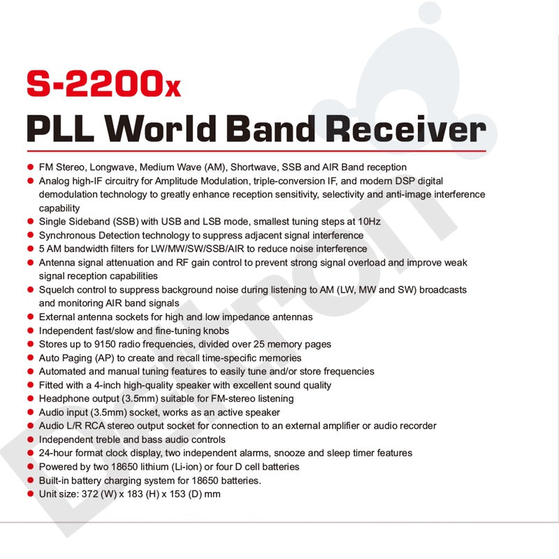 Der Tecsun S2200x ist ein fortschrittlicher digitaler Weltempfänger, ideal für DX-Benutzer, Funkamateure und Hobbyisten. Dieses Radio bietet eine beispiellose Empfangsqualität für AM-, FM-, LW-, MW-, SW- und Airband-Signale. Das moderne Design basiert auf dem vertrauten und benutzerfreundlichen Gehäuse des legendären S2000 von Tecsun , mit verbesserten Technologien, die ein überragendes Hörerlebnis gewährleisten.