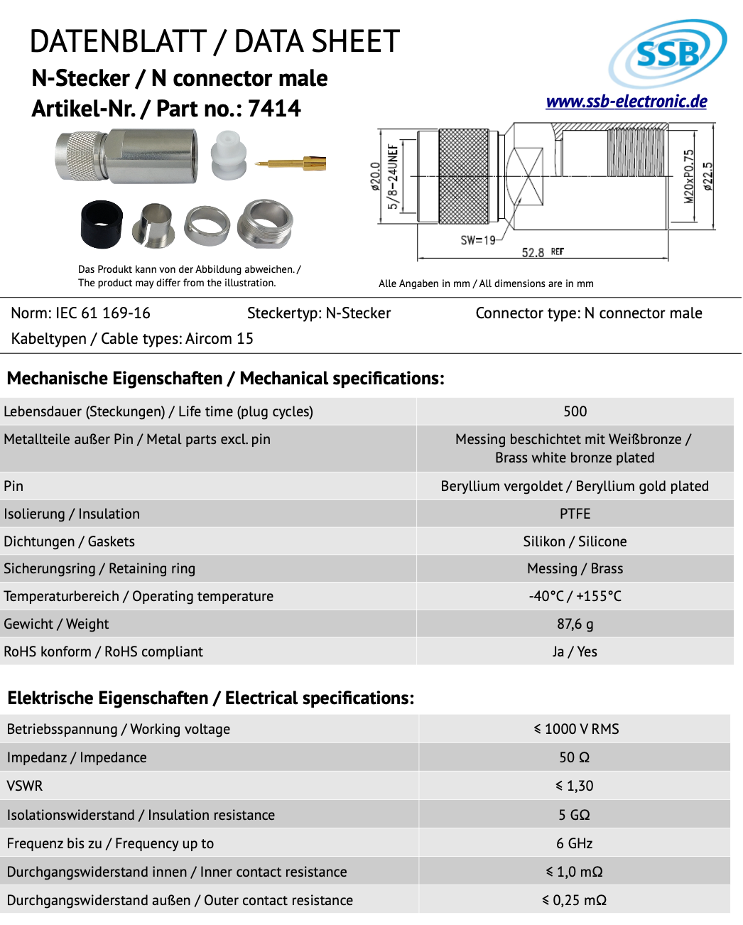 The SSB 7414 is a high-quality N-male connector designed for use with the Aircom 15 and Aircom Premium 15 coaxial cables . This connector offers excellent performance and reliability in various applications requiring high frequencies up to 6 GHz . It is ideal for use in communications equipment, antenna systems, and other applications requiring a robust and efficient connection.