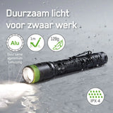 This flashlight works for approx. 20 hours on two (included) AA alkaline batteries and with the handy clip you can easily attach it to your trouser pocket, breast pocket or to a loop of your overalls or other work clothes. You also don't have to worry about a splash of water because the C33 is IPX4 classified.