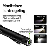 The C33 is also equipped with an additional light source, a built-in COB LED that does not shine forward but to the side. This is ideal for situations where a bright beam of light is not needed. The regular LED has a light output of 150 lumens and two brightness settings with adjustable focus.