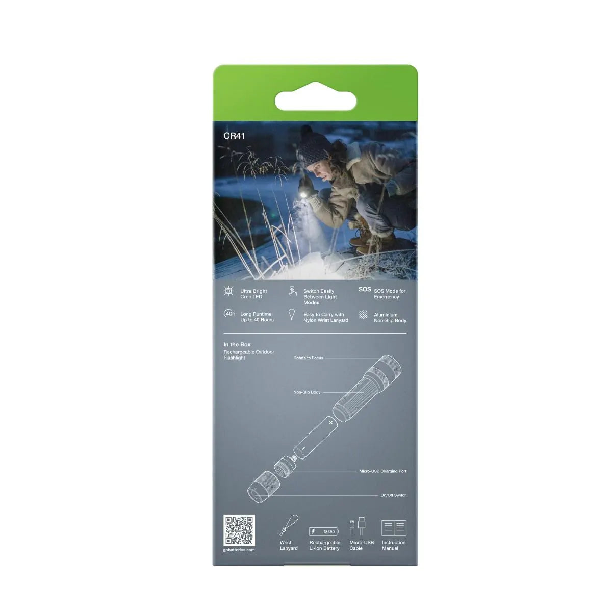 De GP CR41 is een robuuste zaklamp voor intensief gebruik. Deze krachtige en oplaadbare zaklamp komt uit de Discovery serie van GP. De CR41 heeft een lichtsterkte van 650 lumen en de lichtbundel heeft een bereik van ongeveer 135 meter, wat vergelijkbaar is met bijna anderhalf voetbalveld. Volledig opgeladen heeft deze zaklamp een accuduur van ca. 40 uur.
