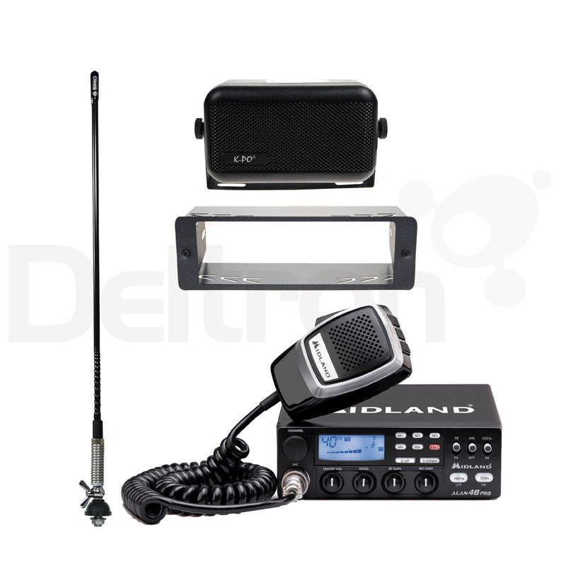 - Midland Alan 48 Pro – Een van de meest populaire 27MHz transceivers, geschikt voor zowel 12 als 24 volt voertuigen. De Alan 48 Pro biedt 40 AM/FM kanalen, duidelijke audio en uitgebreide functies zoals RF Gain, Scan, Mic Gain en PA-functie. De blauw verlichte LCD en instelbare filters zorgen voor optimaal gebruiksgemak.