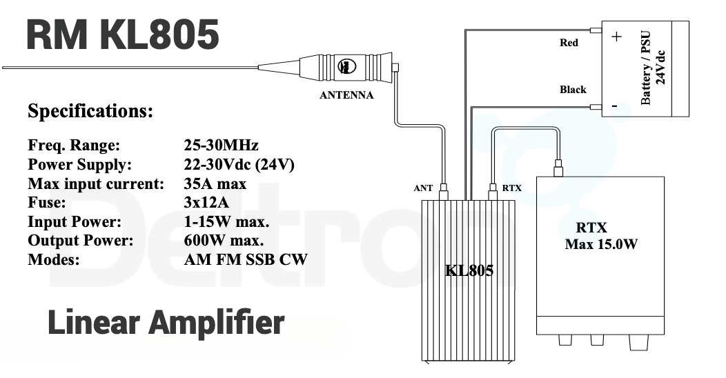 De RM KL-805 is een krachtige RM lineaire versterker ontworpen voor veeleisende radio-amateurs. Met een maximaal zendvermogen van maar liefst 600 watt op zowel FM als SSB/CW en geoptimaliseerd voor het 25 – 30 MHz frequentiebereik, biedt deze lineare amplifier de perfecte combinatie van kracht, betrouwbaarheid en gebruiksgemak.