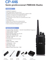 De CP-446 portofoons zijn volledig compatibel met de 16 Kenwood PMR446-kanalen en werken vergunningsvrij met een vermogen van 0,5 Watt (4 Watt op aanvraag, maar wettelijk niet toegestaan). Dankzij hun IP55-bescherming tegen stof en spatwater, en de schokbestendige MIL-STD 810 F-norm, zijn deze portofoons klaar voor intensief gebruik – binnen én buiten.